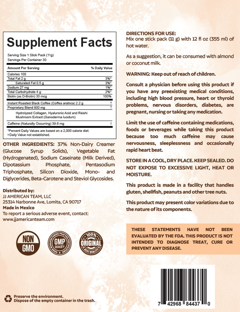 Exquisito Café con GANODERMA, COLAGENO I y III, Ácido Hialuronico y Biotina. Para los amantes del Café con paladar exigente.